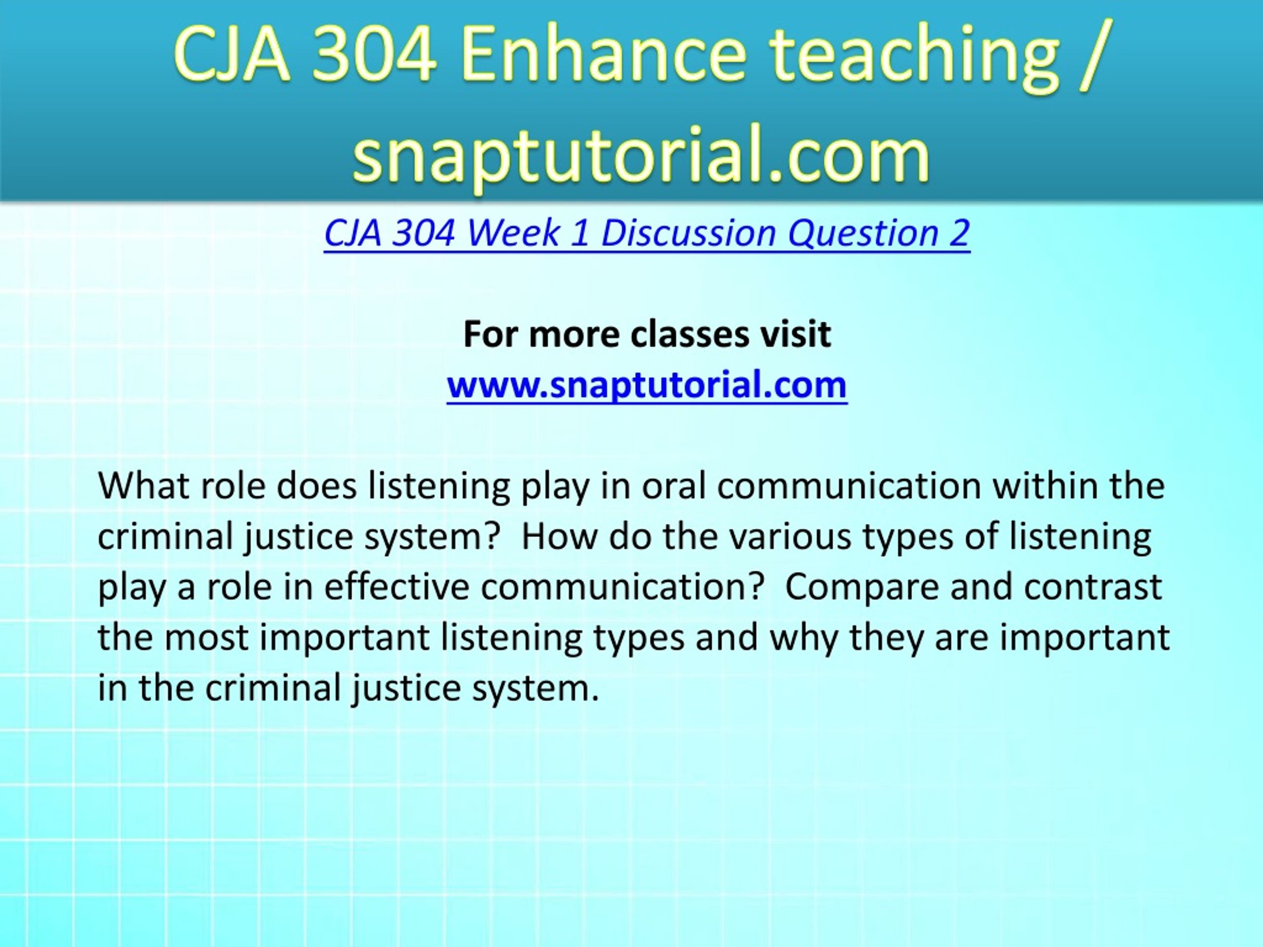 CJA 304 Enhance teaching / snaptutorial.com CJA 304 Week 1 Discussion Question 2 For more classes visit www.snaptutorial.com What role does listening play in oral communication within the criminal justice system? How do the various types of listening play a role in effective communication? Compare and contrast the most important listening types and why they are important in the criminal justice system.