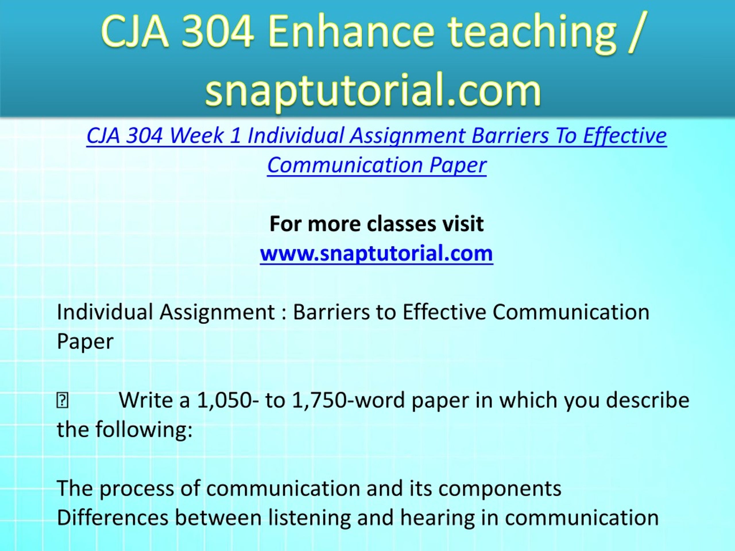 CJA 304 Enhance teaching / snaptutorial.com CJA 304 Week 1 Individual Assignment Barriers To Effective Communication Paper For more classes visit www.snaptutorial.com Individual Assignment : Barriers to Effective Communication Paper Write a 1,050- to 1,750-word paper in which you describe the following: The process of communication and its components Differences between listening and hearing in communication