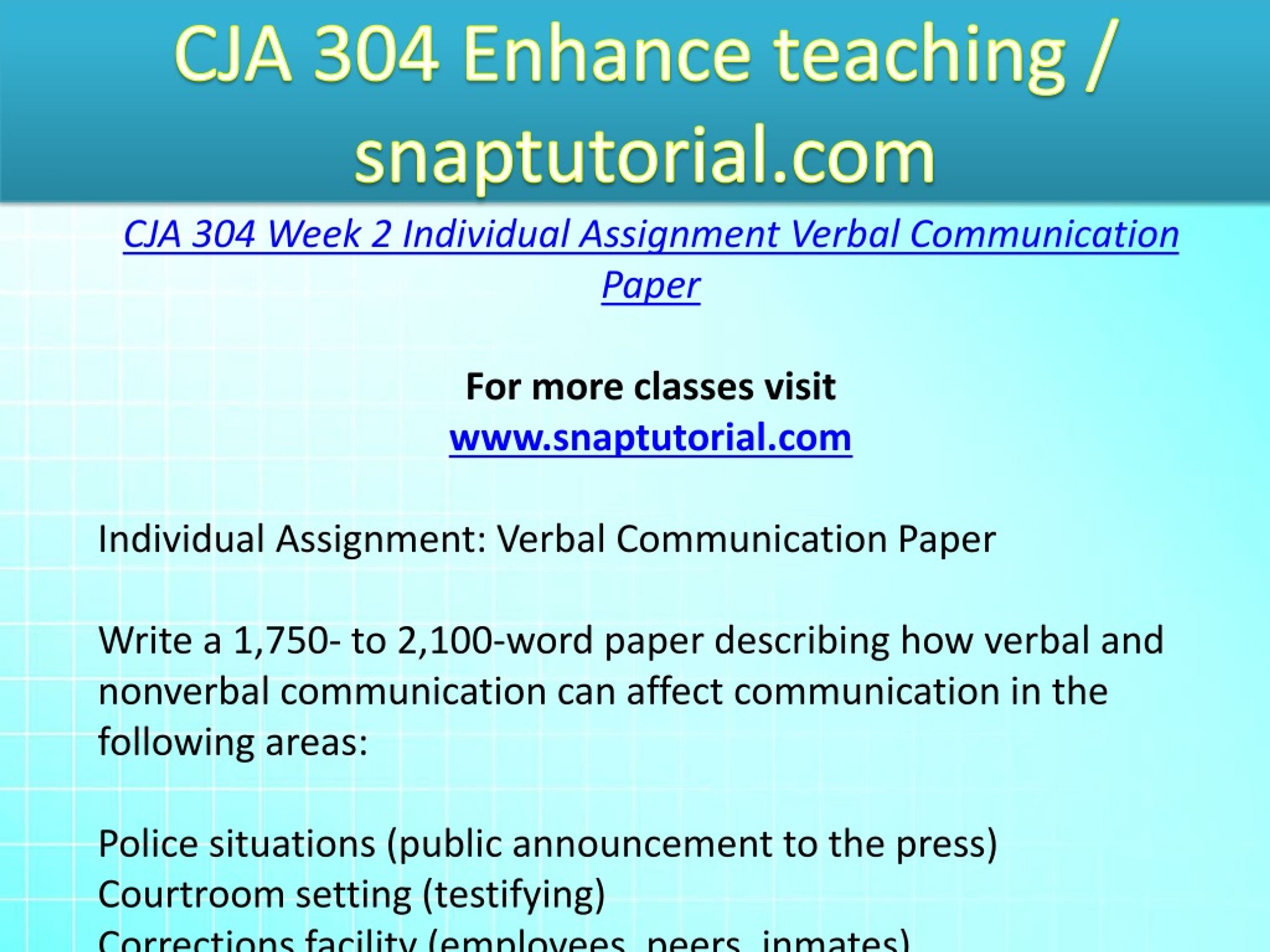 CJA 304 Enhance teaching / snaptutorial.com CJA 304 Week 2 Individual Assignment Verbal Communication Paper For more classes visit www.snaptutorial.com Individual Assignment: Verbal Communication Paper Write a 1,750- to 2,100-word paper describing how verbal and nonverbal communication can affect communication in the following areas: Police situations (public announcement to the press) Courtroom setting (testifying) Corrections facility (employees, peers, inmates)