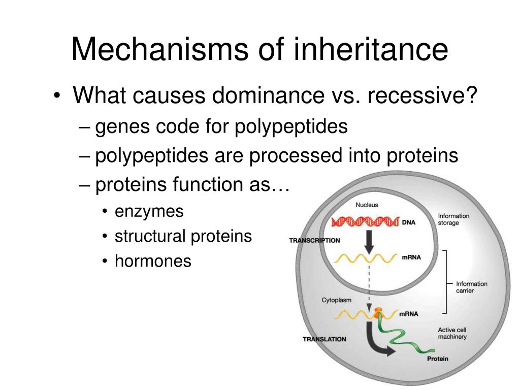 Mechanisms of inheritance • What causes dominance vs. recessive? • genes code for polypeptides • polypeptides are processed into proteins • proteins function as… • enzymes • structural proteins • hormones