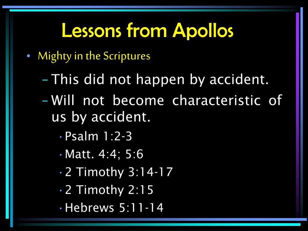 Lessons from Apollos • Mighty in the Scriptures • This did not happen by accident. • Will not become characteristic of us by accident. • Psalm 1:2-3 • Matt. 4:4; 5:6 • 2 Timothy 3:14-17 • 2 Timothy 2:15 • Hebrews 5:11-14