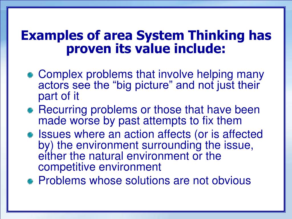 Examples of area System Thinking has proven its value include: • Complex problems that involve helping many actors see the “big picture” and not just their part of it • Recurring problems or those that have been made worse by past attempts to fix them • Issues where an action affects (or is affected by) the environment surrounding the issue, either the natural environment or the competitive environment • Problems whose solutions are not obvious