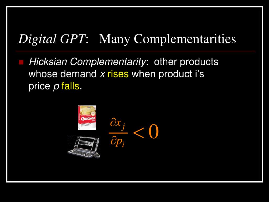Digital GPT: Many Complementarities • Hicksian Complementarity: other products whose demand xrises when product i’s price pfalls.