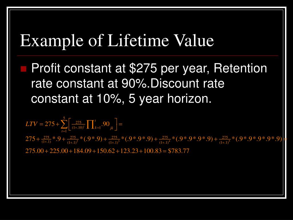 Example of Lifetime Value • Profit constant at $275 per year, Retention rate constant at 90%.Discount rate constant at 10%, 5 year horizon.