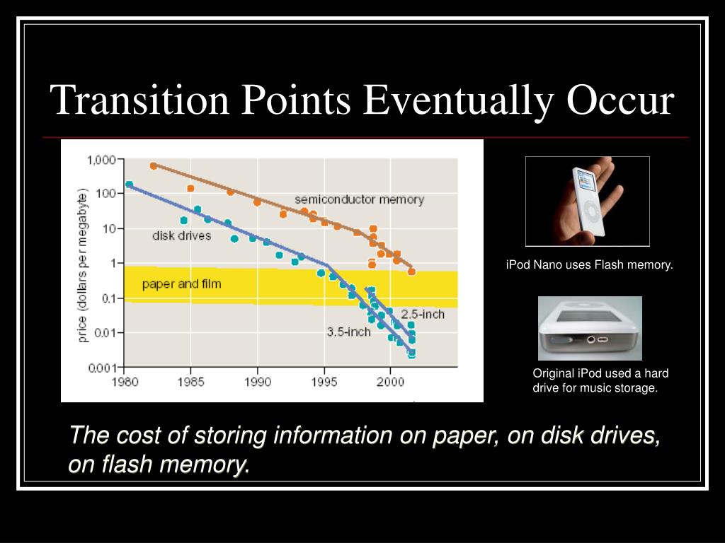 Transition Points Eventually Occur iPod Nano uses Flash memory. Original iPod used a hard drive for music storage. The cost of storing information on paper, on disk drives, on flash memory.