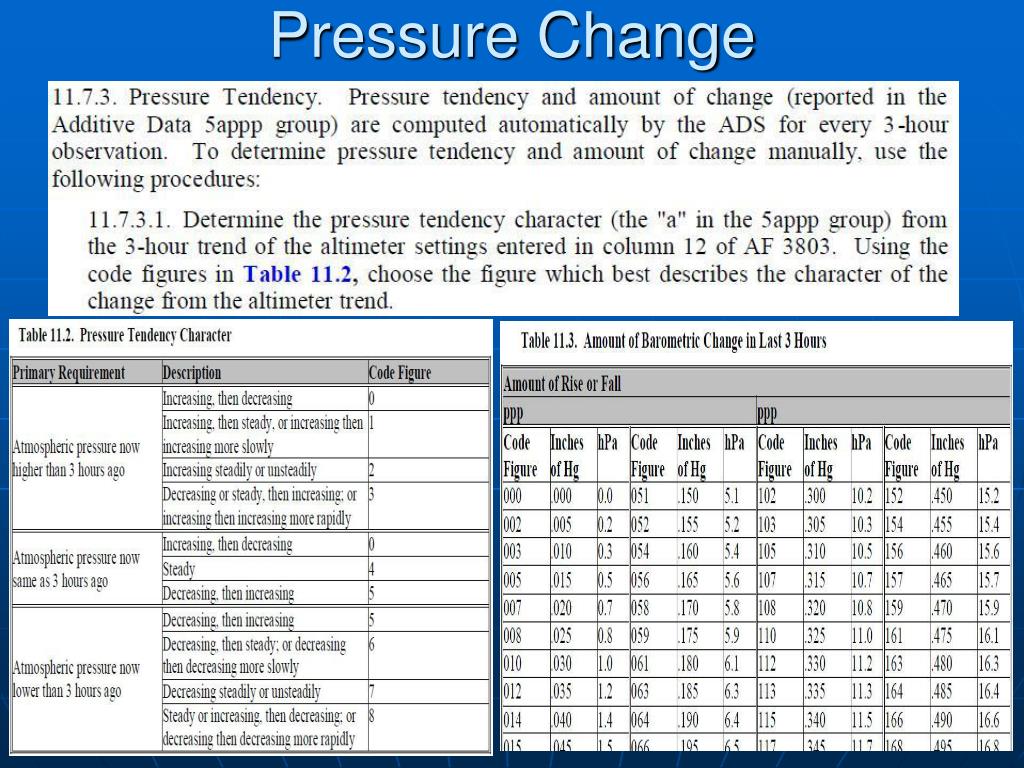 Definitions • Sea Level Pressure (SLP) (QFF) • Standard Atmosphere (29.92inches, 1013.2hPa) • Station Pressure (QFE) • Units of Measure (1 hPa = 1 millibar) • Pressure Change • Rising Rapidly • Falling Rapidly • Tendency