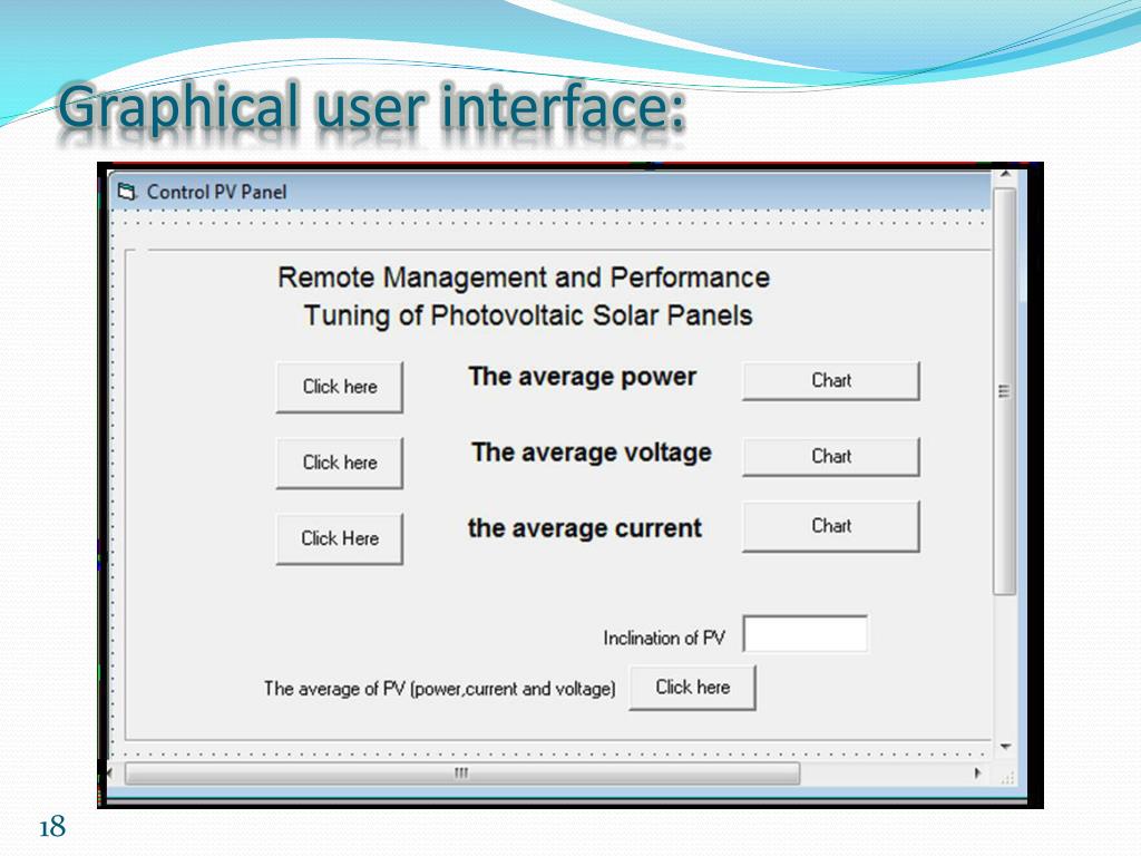 Introduction: • This project aims at designing and implementing a remote management system for solar panels using wireless communications. • The management system can be used to control the PV panel and to tune its performance. • The system shall state the parameters of PV panels at different inclination.