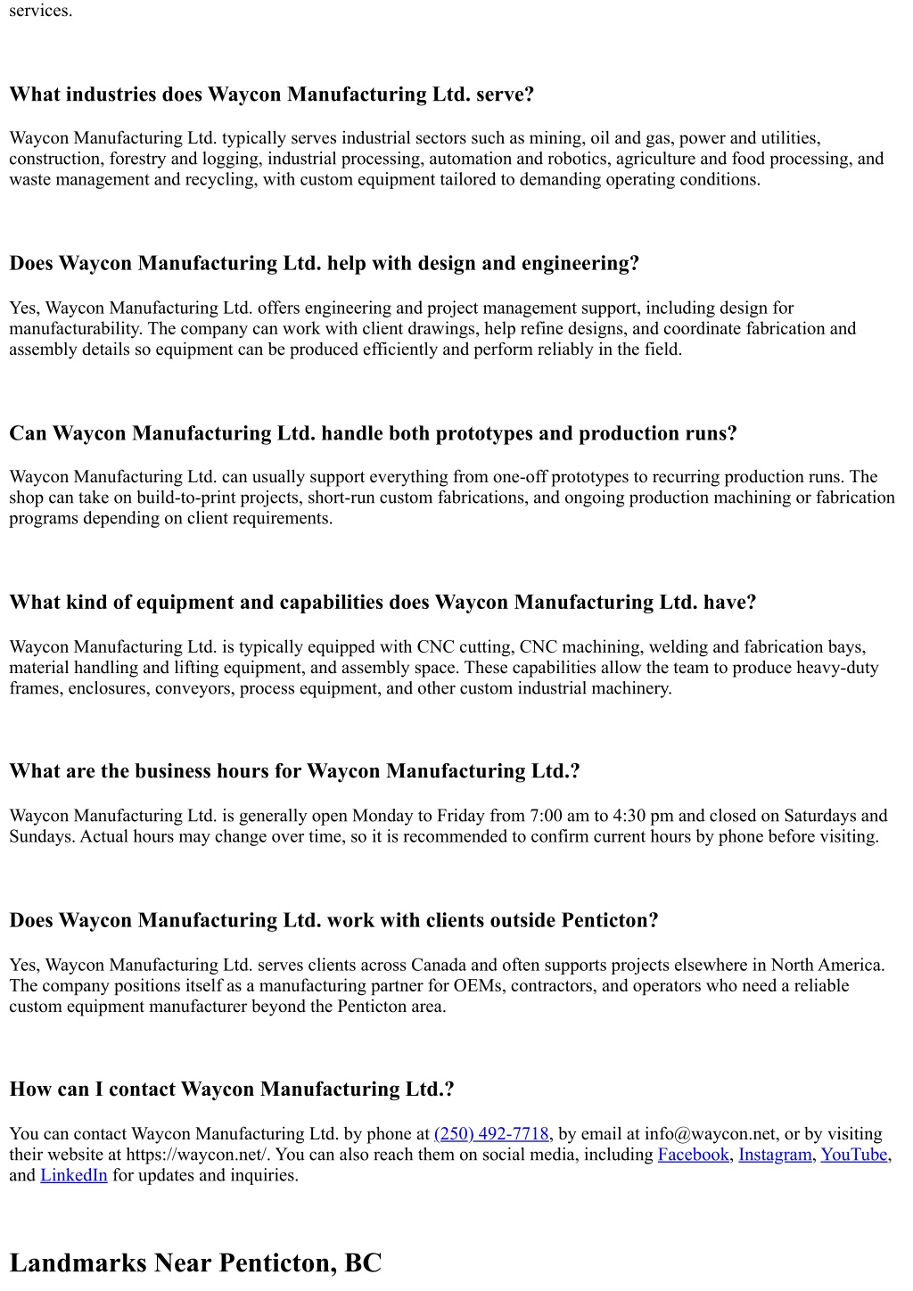 services. What industries does Waycon Manufacturing Ltd. serve? Waycon Manufacturing Ltd. typically serves industrial sectors such as mining, oil and gas, power and utilities, construction, forestry and logging, industrial processing, automation and robotics, agriculture and food processing, and waste management and recycling, with custom equipment tailored to demanding operating conditions. Does Waycon Manufacturing Ltd. help with design and engineering? Yes, Waycon Manufacturing Ltd. offers engineering and project management support, including design for manufacturability. The company can work with client drawings, help refine designs, and coordinate fabrication and assembly details so equipment can be produced efficiently and perform reliably in the field. Can Waycon Manufacturing Ltd. handle both prototypes and production runs? Waycon Manufacturing Ltd. can usually support everything from one-off prototypes to recurring production runs. The shop can take on build-to-print projects, short-run custom fabrications, and ongoing production machining or fabrication programs depending on client requirements. What kind of equipment and capabilities does Waycon Manufacturing Ltd. have? Waycon Manufacturing Ltd. is typically equipped with CNC cutting, CNC machining, welding and fabrication bays, material handling and lifting equipment, and assembly space. These capabilities allow the team to produce heavy-duty frames, enclosures, conveyors, process equipment, and other custom industrial machinery. What are the business hours for Waycon Manufacturing Ltd.? Waycon Manufacturing Ltd. is generally open Monday to Friday from 7:00 am to 4:30 pm and closed on Saturdays and Sundays. Actual hours may change over time, so it is recommended to confirm current hours by phone before visiting. Does Waycon Manufacturing Ltd. work with clients outside Penticton? Yes, Waycon Manufacturing Ltd. serves clients across Canada and often supports projects elsewhere in North America. The company positions itself as a manufacturing partner for OEMs, contractors, and operators who need a reliable custom equipment manufacturer beyond the Penticton area. How can I contact Waycon Manufacturing Ltd.? You can contact Waycon Manufacturing Ltd. by phone at (250) 492-7718, by email at info@waycon.net, or by visiting their website at https://waycon.net/. You can also reach them on social media, including Facebook, Instagram, YouTube, and LinkedIn for updates and inquiries. Landmarks Near Penticton, BC