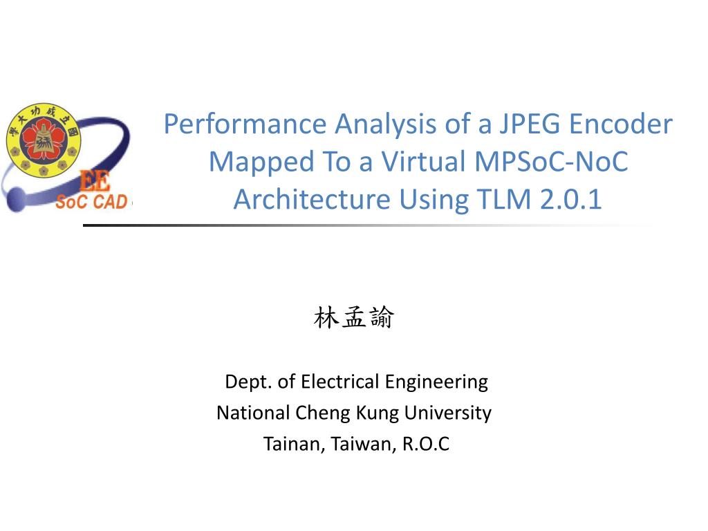 Performance Analysis of a JPEG Encoder Mapped To a Virtual MPSoC-NoC Architecture Using TLM 2.0.1 林孟諭 Dept. of Electrical Engineering National Cheng Kung University Tainan, Taiwan, R.O.C