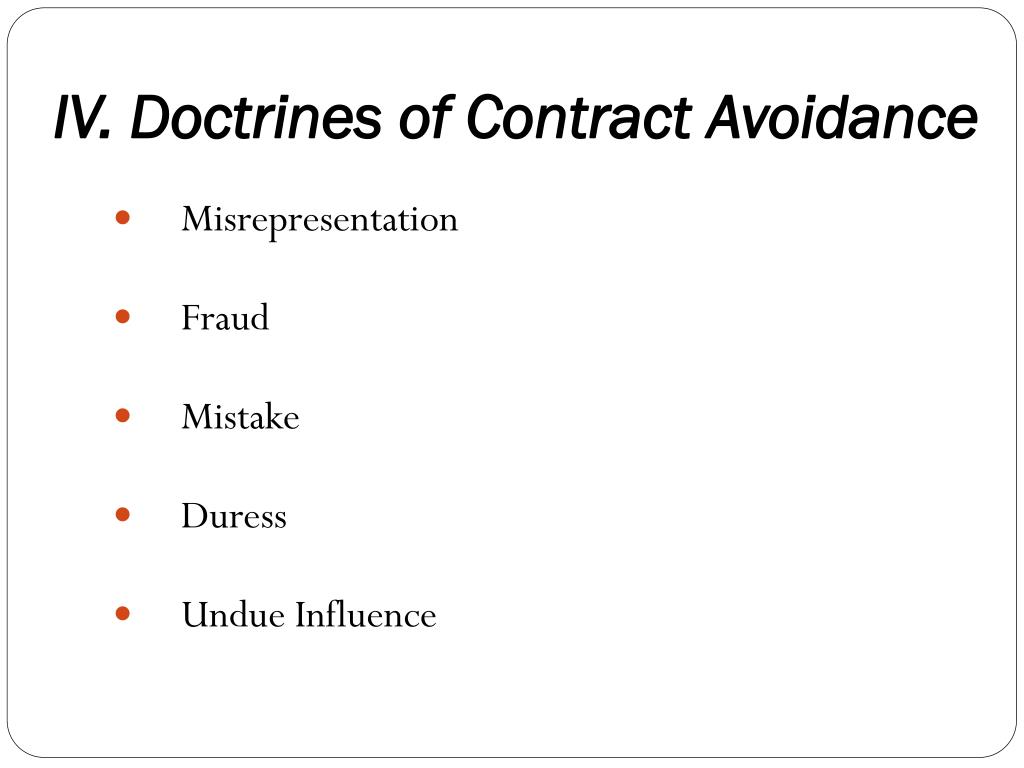 IV. Doctrines of Contract Avoidance • Misrepresentation • Fraud • Mistake • Duress • Undue Influence