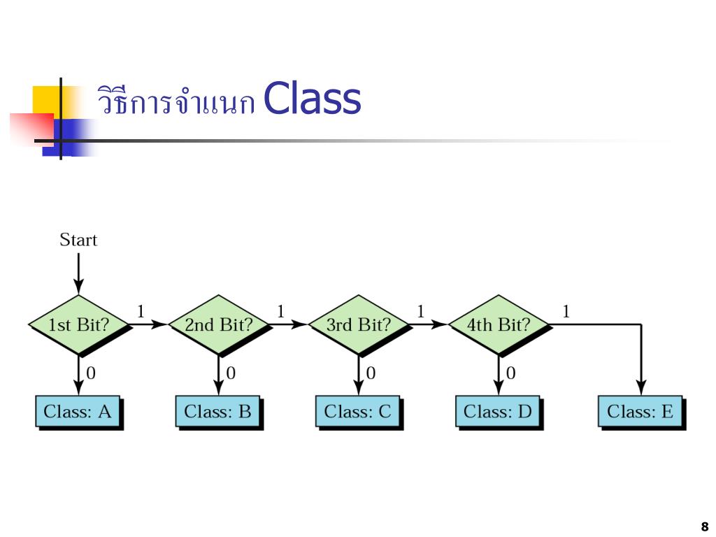 IP Subnet Addressing • IP Subnet Addressing คือการแบ่ง IP ออกเป็นกลุ่มย่อย เรียกว่า “subnetworksหรือsubnets ” • การแบ่ง subnets มีประโยชน์โดยตรงต่อผู้บริหารระบบเครือข่าย ได้แก่ เป็นการจัดสรรหมายเลข IP ที่สอดคล้องกับจำนวนที่มีความต้องใช้ ทำให้ใช้ IP ได้อย่างมีประสิทธิภาพ สามารถควบคุมการ broadcast ภายในเครือข่ายให้มีขนาดที่จำจัดได้