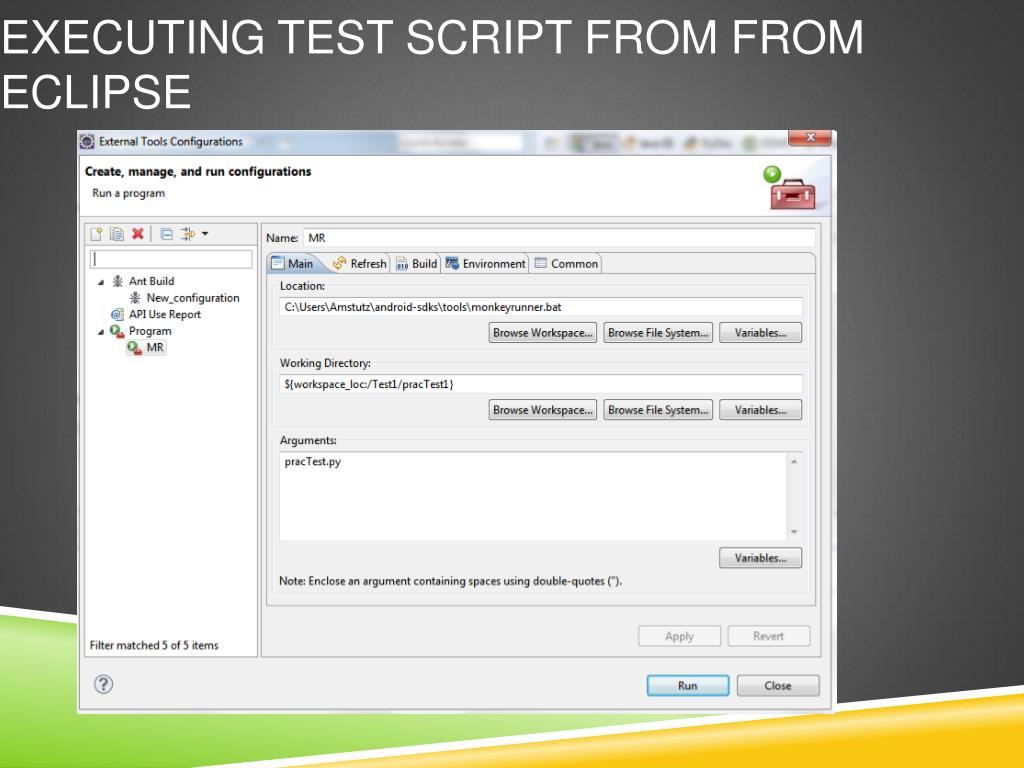 Executing Test script from command prompt Use the following command format: monkeyrunner –v ALL <direct path to .py script>