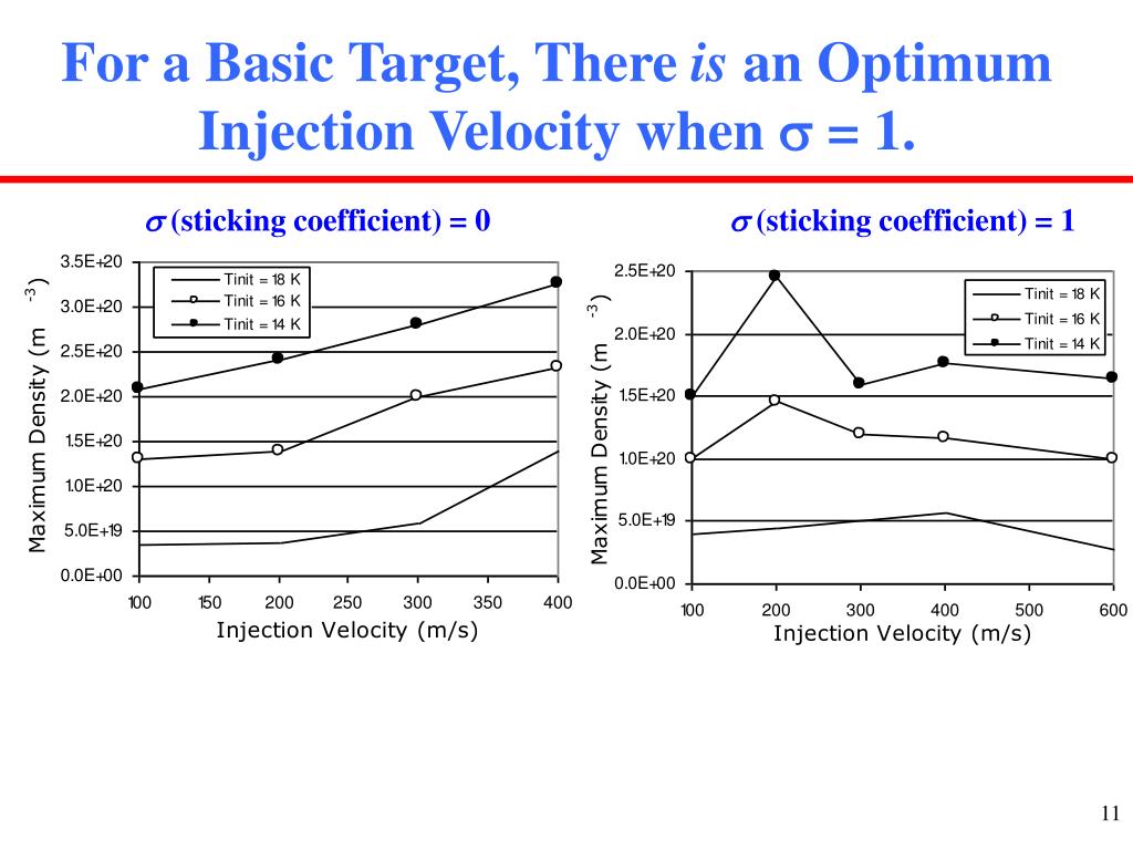 For a Basic Target, There is an Optimum Injection Velocity when s = 1. s (sticking coefficient) = 0 s (sticking coefficient) = 1