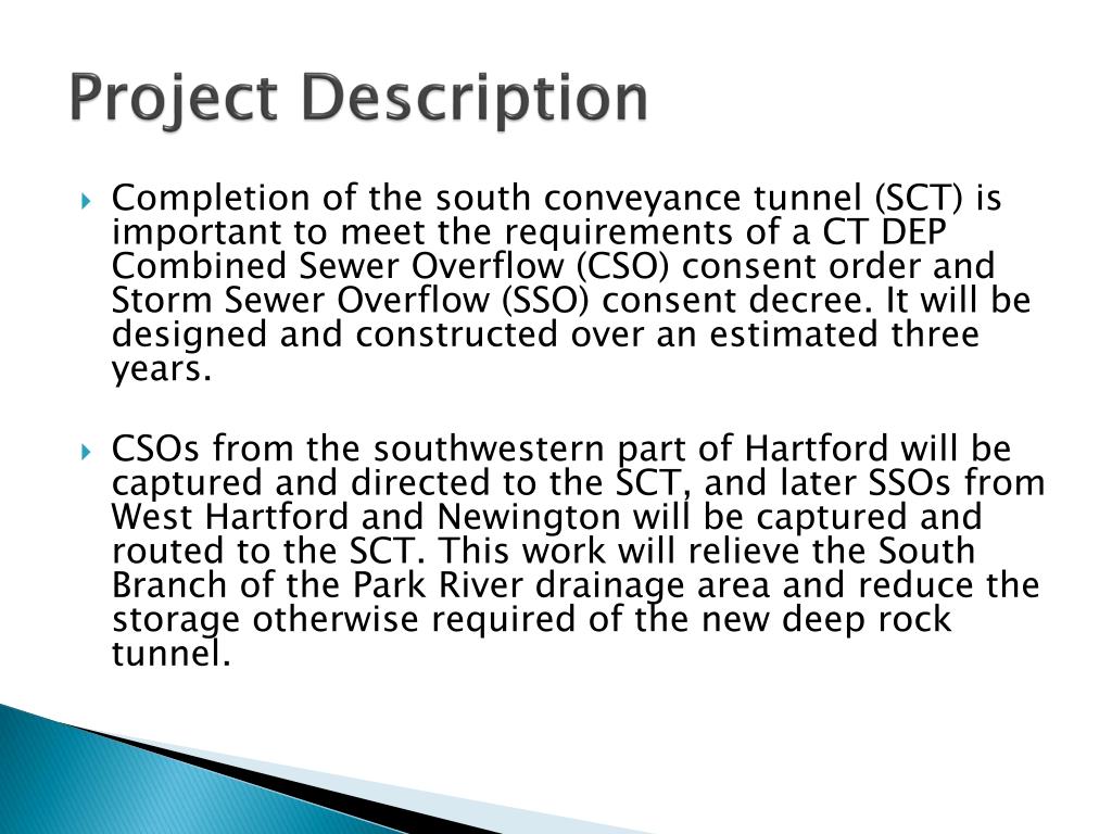 Project Description • Completion of the south conveyance tunnel (SCT) is important to meet the requirements of a CT DEP Combined Sewer Overflow (CSO) consent order and Storm Sewer Overflow (SSO) consent decree. It will be designed and constructed over an estimated three years. • CSOs from the southwestern part of Hartford will be captured and directed to the SCT, and later SSOs from West Hartford and Newington will be captured and routed to the SCT. This work will relieve the South Branch of the Park River drainage area and reduce the storage otherwise required of the new deep rock tunnel.