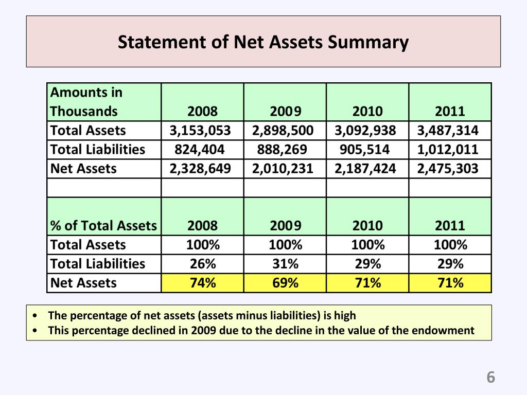 Statement of Net Assets Summary • The percentage of net assets (assets minus liabilities) is high • This percentage declined in 2009 due to the decline in the value of the endowment