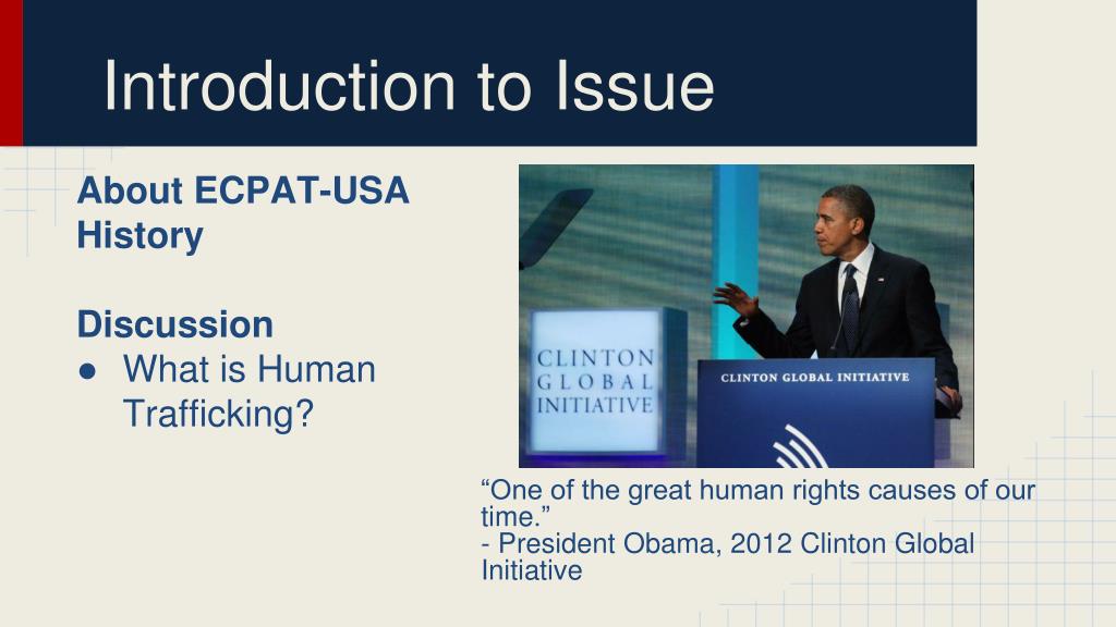 Introduction to Issue • About ECPAT-USA History • Discussion • What is Human Trafficking? “One of the great human rights causes of our time.” -President Obama, 2012 Clinton Global Initiative