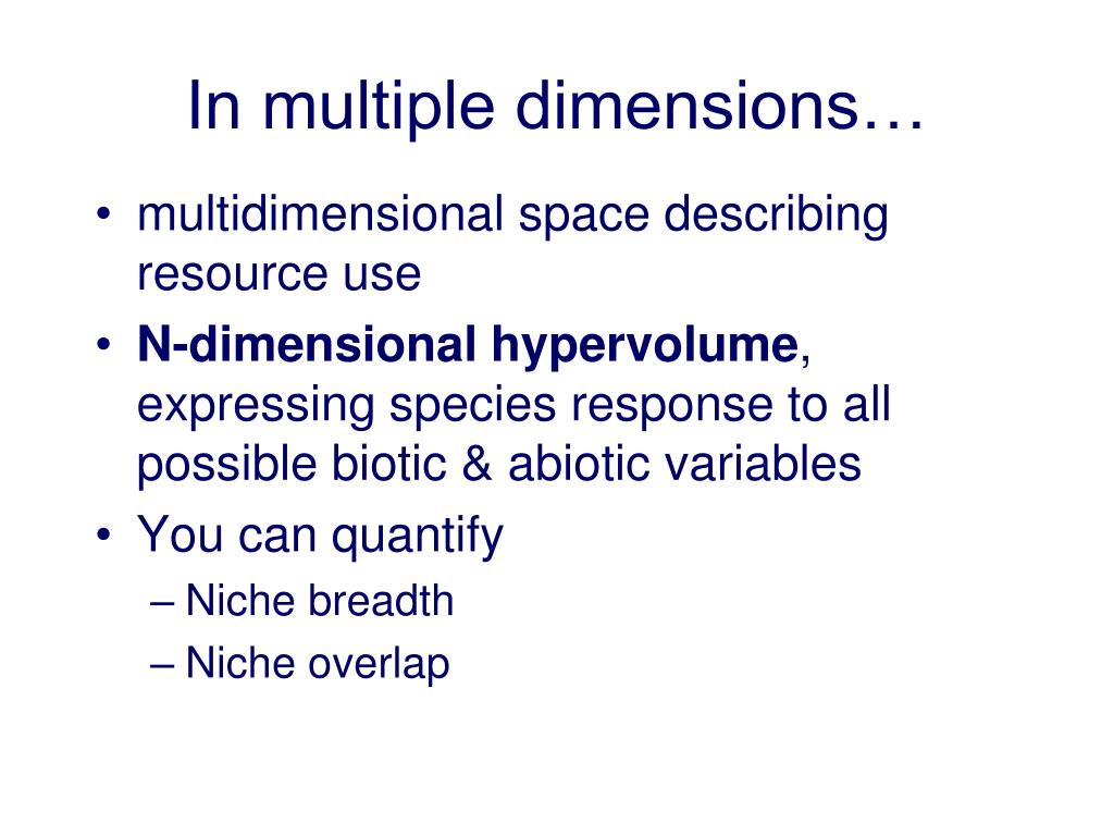 In multiple dimensions… • multidimensional space describing resource use • N-dimensional hypervolume, expressing species response to all possible biotic & abioticvariables • You can quantify • Niche breadth • Niche overlap