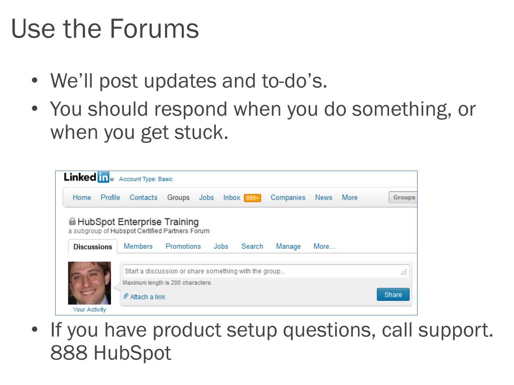 Use the Forums • We’ll post updates and to-do’s. • You should respond when you do something, or when you get stuck. • If you have product setup questions, call support. 888 HubSpot