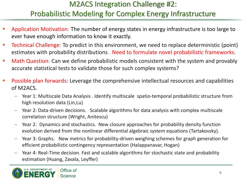 M2ACS Integration Challenge #2: Probabilistic Modeling for Complex Energy Infrastructure • Application Motivation: The number of energy states in energy infrastructure is too large to ever have enough information to know it exactly. • Technical Challenge: To predict in this environment, we need to replace deterministic (point) estimates with probability distributions . Need to formulate novel probabilistic frameworks. • Math Question: Can we define probabilistic models consistent with the system and provably accurate statistical tests to validate those for such complex systems? • Possible plan forwards: Leverage the comprehensive intellectual resources and capabilities of M2ACS. • Year 1: MultiscaleData Analysis . Identify multiscalespatio-temporal probabilistic structure from high resolution data (Lin,Lu) • Year 2: Data-driven decisions. Scalable algorithms for data analysis with complex multiscale correlation structure (Wright, Anitescu) • Year 2: Dynamics and stochastics. New closure approaches for probability density function evolution derived from the nonlinear differential algebraic system equations (Tartakovsky). • Year 3: Graphs. New metrics for probability-driven weighing schemes for graph generation for efficient probabilistic contingency representation(Halappanavar, Hogan) • Year 4: Real-Time decision. Fast and scalable algorithms for stochastic state and probability estimation (Huang, Zavala, Leyffer)