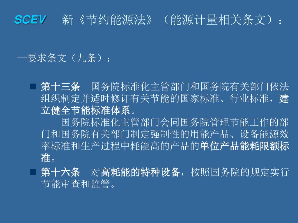 新《节约能源法》(能源计量相关条文): —要求条文(九条): • 第十三条 国务院标准化主管部门和国务院有关部门依法组织制定并适时修订有关节能的国家标准、行业标准,建立健全节能标准体系。 国务院标准化主管部门会同国务院管理节能工作的部门和国务院有关部门制定强制性的用能产品、设备能源效率标准和生产过程中耗能高的产品的单位产品能耗限额标准。 • 第十六条 对高耗能的特种设备,按照国务院的规定实行节能审查和监管。