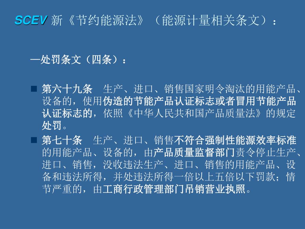 新《节约能源法》(能源计量相关条文): —处罚条文(四条): • 第六十九条 生产、进口、销售国家明令淘汰的用能产品、设备的,使用伪造的节能产品认证标志或者冒用节能产品认证标志的,依照《中华人民共和国产品质量法》的规定处罚。 • 第七十条 生产、进口、销售不符合强制性能源效率标准的用能产品、设备的,由产品质量监督部门责令停止生产、进口、销售,没收违法生产、进口、销售的用能产品、设备和违法所得,并处违法所得一倍以上五倍以下罚款;情节严重的,由工商行政管理部门吊销营业执照。