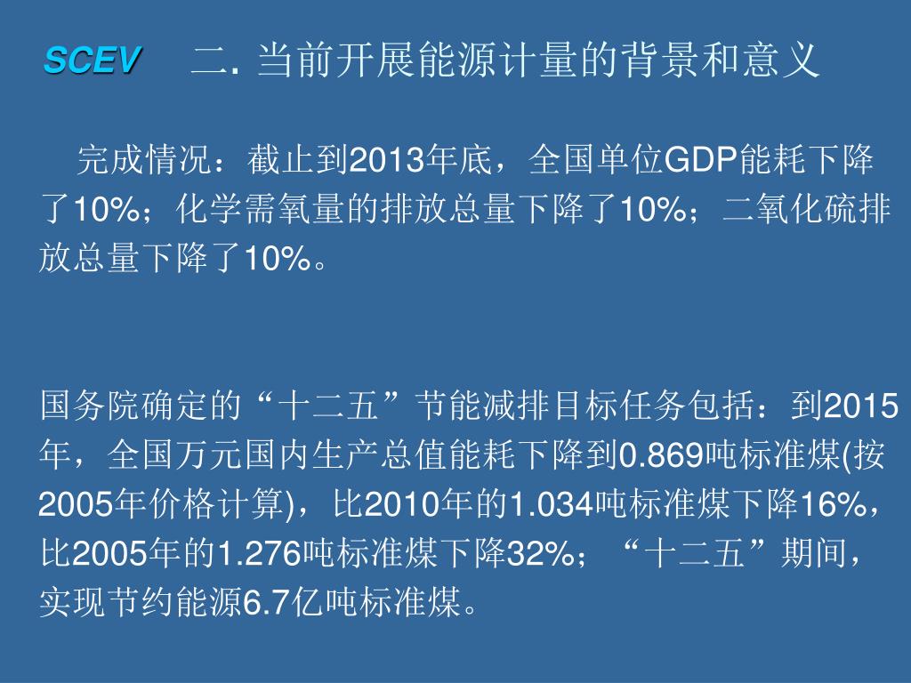 二. 当前开展能源计量的背景和意义 完成情况:截止到2013年底,全国单位GDP能耗下降了10%;化学需氧量的排放总量下降了10%;二氧化硫排放总量下降了10%。 国务院确定的“十二五”节能减排目标任务包括:到2015年,全国万元国内生产总值能耗下降到0.869吨标准煤(按2005年价格计算),比2010年的1.034吨标准煤下降16%,比2005年的1.276吨标准煤下降32%;“十二五”期间,实现节约能源6.7亿吨标准煤。