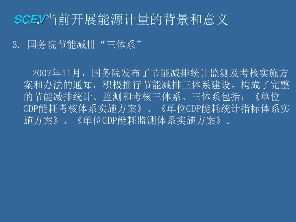 二. 当前开展能源计量的背景和意义 3. 国务院节能减排“三体系” 2007年11月,国务院发布了节能减排统计监测及考核实施方案和办法的通知,积极推行节能减排三体系建设。构成了完整的节能减排统计、监测和考核三体系。三体系包括:《单位GDP能耗考核体系实施方案》、《单位GDP能耗统计指标体系实施方案》、《单位GDP能耗监测体系实施方案》。