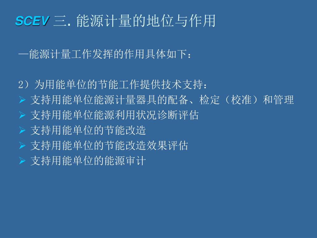 三. 能源计量的地位与作用 —能源计量工作发挥的作用具体如下: 2)为用能单位的节能工作提供技术支持: • 支持用能单位能源计量器具的配备、检定(校准)和管理 • 支持用能单位能源利用状况诊断评估 • 支持用能单位的节能改造 • 支持用能单位的节能改造效果评估 • 支持用能单位的能源审计