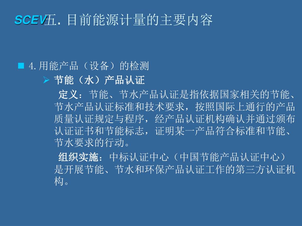 五. 目前能源计量的主要内容 • 4.用能产品(设备)的检测 • 节能(水)产品认证 定义:节能、节水产品认证是指依据国家相关的节能、节水产品认证标准和技术要求,按照国际上通行的产品质量认证规定与程序,经产品认证机构确认并通过颁布认证证书和节能标志,证明某一产品符合标准和节能、节水要求的行动。 组织实施:中标认证中心(中国节能产品认证中心)是开展节能、节水和环保产品认证工作的第三方认证机构。