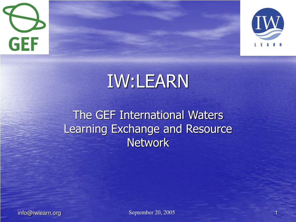 IW:LEARN. The GEF International Waters Learning Exchange and Resource Network. September 20, 2005. GEF IW:LEARN Objective. To strengthen Transboundary Waters Management (TWM) by facilitating learning and information sharing among stakeholders. How?.