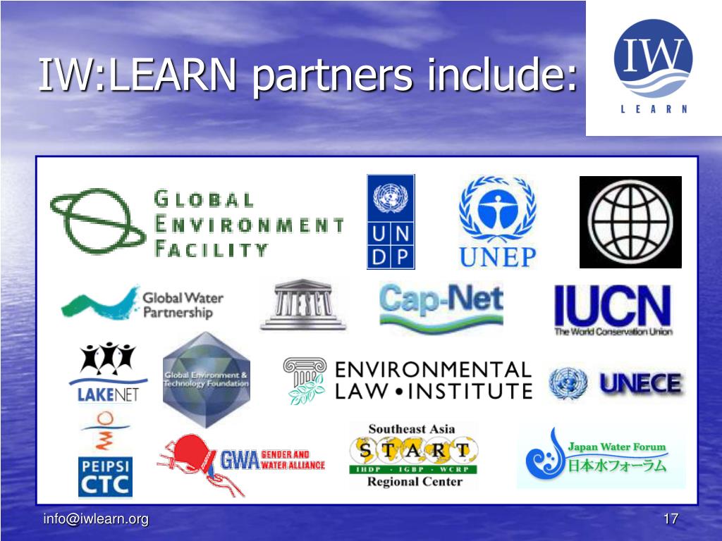 For more information • Please visit… • GEF IW:LEARN Web Site www.iwlearn.org • GEF International Waters Resource Centre www.iwlearn.net • Or contact IW:LEARN info@iwlearn.org Tel: +1 (202) 518-2054