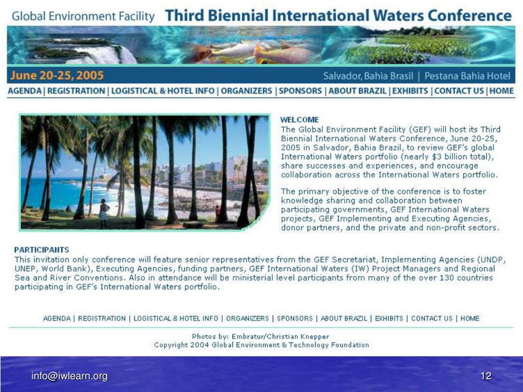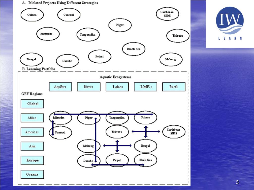 IW:LEARN as a Learning PortfolioProject Components • IW Information Sharing and Access for stakeholders • Structured Learning among IW partners by region and ecosystem-type • Coordinating 3rd and 4thGEF IW Conferences in Latin America (Brazil, 2005) and Africa (Cape Town, 2007) • Testing and Transferring innovative approaches to strengthen freshwater and marine IW initiatives • Fostering Partnerships to sustain IW:LEARN benefits