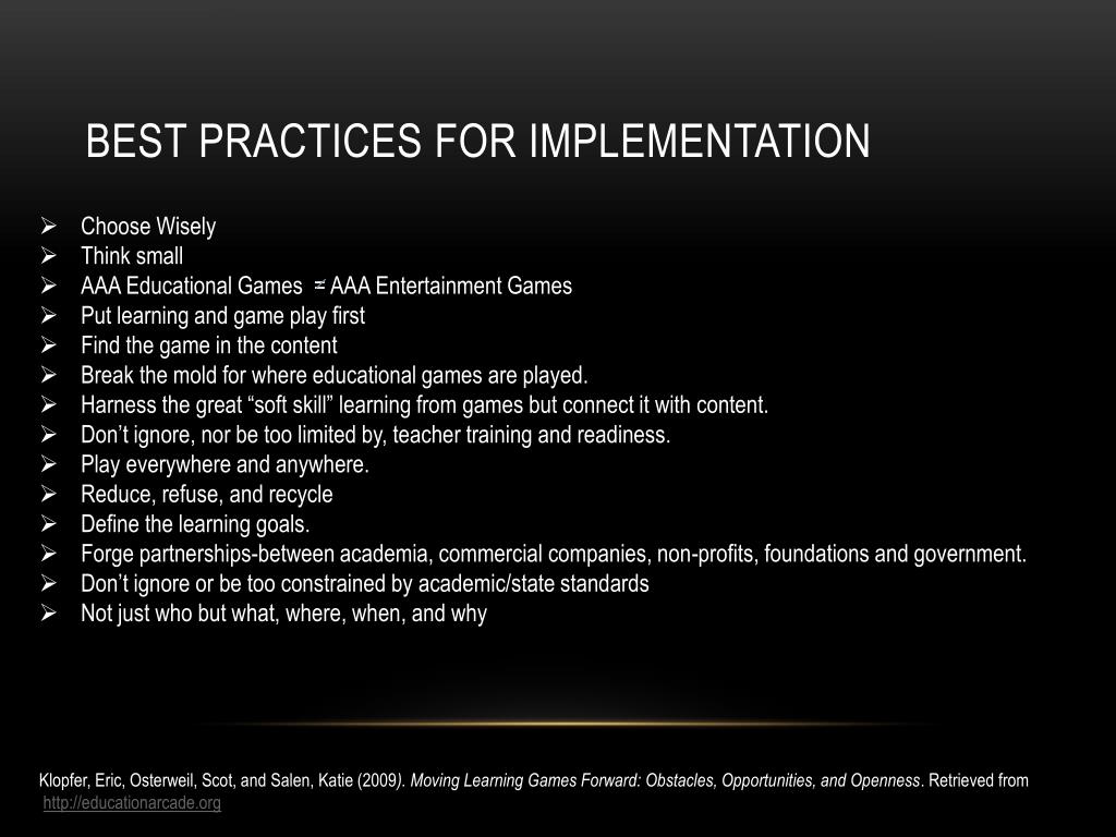 Best Practices for implementation • Choose Wisely • Think small • AAA Educational Games = AAA Entertainment Games • Put learning and game play first • Find the game in the content • Break the mold for where educational games are played. • Harness the great “soft skill” learning from games but connect it with content. • Don’t ignore, nor be too limited by, teacher training and readiness. • Play everywhere and anywhere. • Reduce, refuse, and recycle • Define the learning goals. • Forge partnerships-between academia, commercial companies, non-profits, foundations and government. • Don’t ignore or be too constrained by academic/state standards • Not just who but what, where, when, and why Klopfer, Eric, Osterweil, Scot, and Salen, Katie (2009). Moving Learning Games Forward: Obstacles, Opportunities, and Openness. Retrieved from http://educationarcade.org