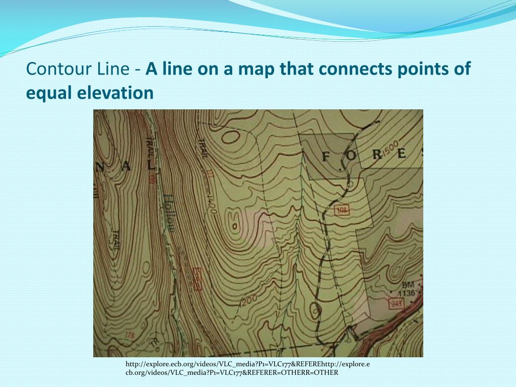 Contour Line - A line on a map that connects points of equal elevation http://explore.ecb.org/videos/VLC_media?P1=VLC177&REFEREhttp://explore.ecb.org/videos/VLC_media?P1=VLC177&REFERER=OTHERR=OTHER
