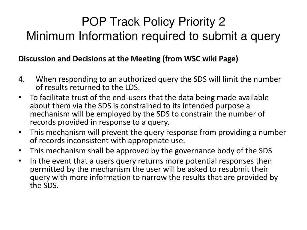 POP Track Policy Priority 2Minimum Information required to submit a query Discussion and Decisions at the Meeting (from WSC wiki Page) • When responding to an authorized query the SDS will limit the number of results returned to the LDS. • To facilitate trust of the end-users that the data being made available about them via the SDS is constrained to its intended purpose a mechanism will be employed by the SDS to constrain the number of records provided in response to a query. • This mechanism will prevent the query response from providing a number of records inconsistent with appropriate use. • This mechanism shall be approved by the governance body of the SDS • In the event that a users query returns more potential responses then permitted by the mechanism the user will be asked to resubmit their query with more information to narrow the results that are provided by the SDS.