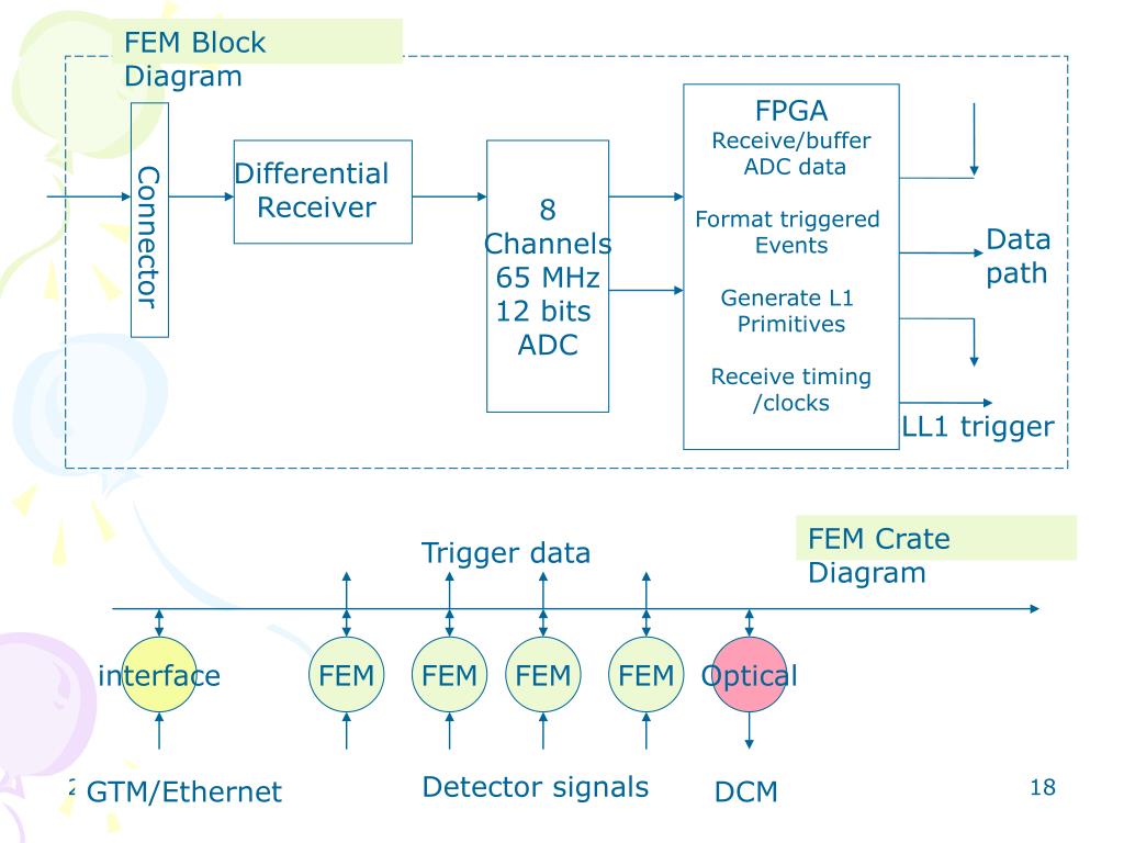FEM Block Diagram FPGA Receive/buffer ADC data Format triggered Events Generate L1 Primitives Receive timing /clocks 8 Channels 65 MHz 12 bits ADC Differential Receiver Connector Data path LL1 trigger FEM Crate Diagram Trigger data interface FEM FEM FEM FEM Optical Detector signals GTM/Ethernet K. Ozawa DCM