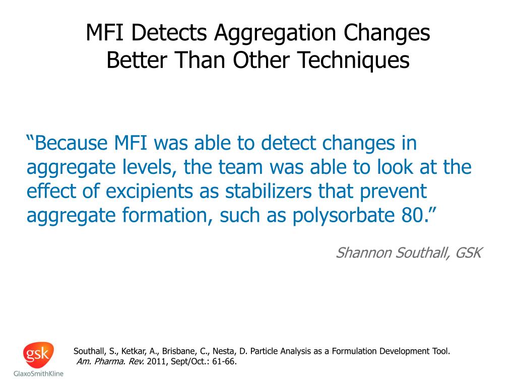 MFI Detects Aggregation Changes Better Than Other Techniques • “Because MFI was able to detect changes in aggregate levels, the team was able to look at the effect of excipients as stabilizers that prevent aggregate formation, such as polysorbate 80.” • Shannon Southall, GSK Southall, S., Ketkar, A., Brisbane, C., Nesta, D. Particle Analysis as a Formulation Development Tool. Am. Pharma. Rev. 2011, Sept/Oct.: 61-66.