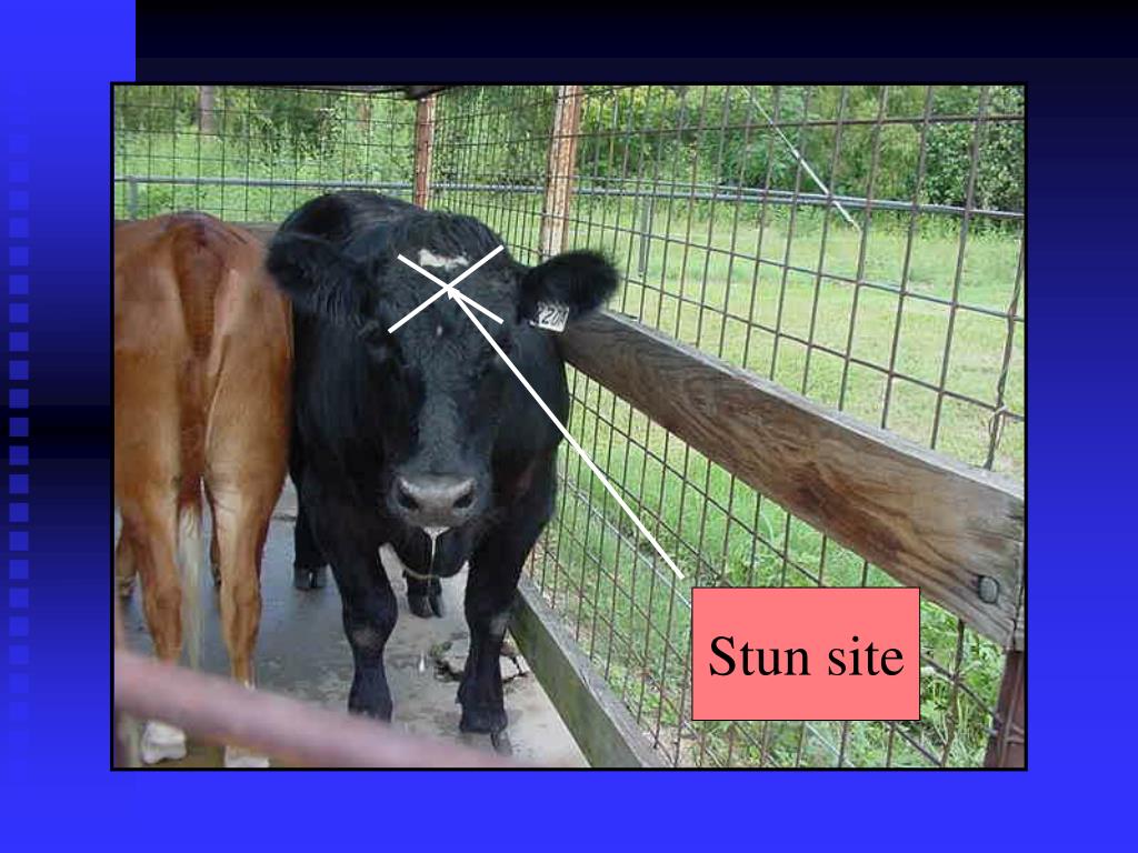 AGR 376-Meat Processing Technology. Beef Slaughter Procedures and Carcass Identification. Captive Bolt Stun Gun. Stun site. Stun site. Sticking. 3-3.5% of live wt. is lost as blood. Sticking severs Jugular Vein and Carotid Artery. Removal of head between the Atlas and Axis