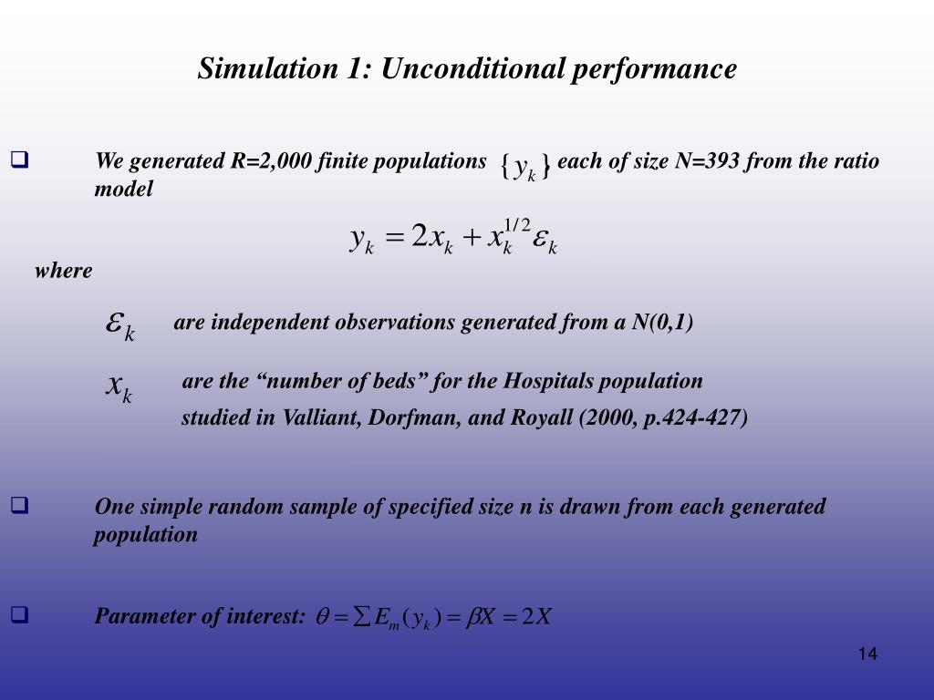 Simulation 1: Unconditional performance • We generated R=2,000 finite populations , each of size N=393 from the ratio model where are independent observations generated from a N(0,1) are the “number of beds” for the Hospitals population studied in Valliant, Dorfman, and Royall (2000, p.424-427) • One simple random sample of specified size n is drawn from each generated population • Parameter of interest: