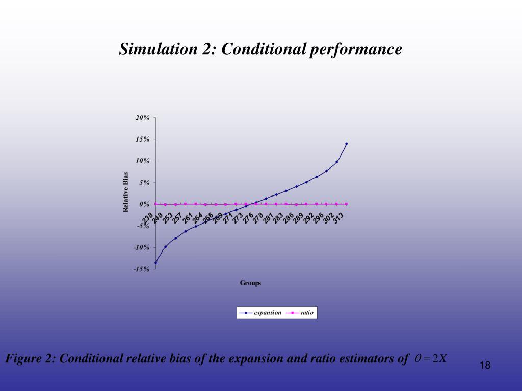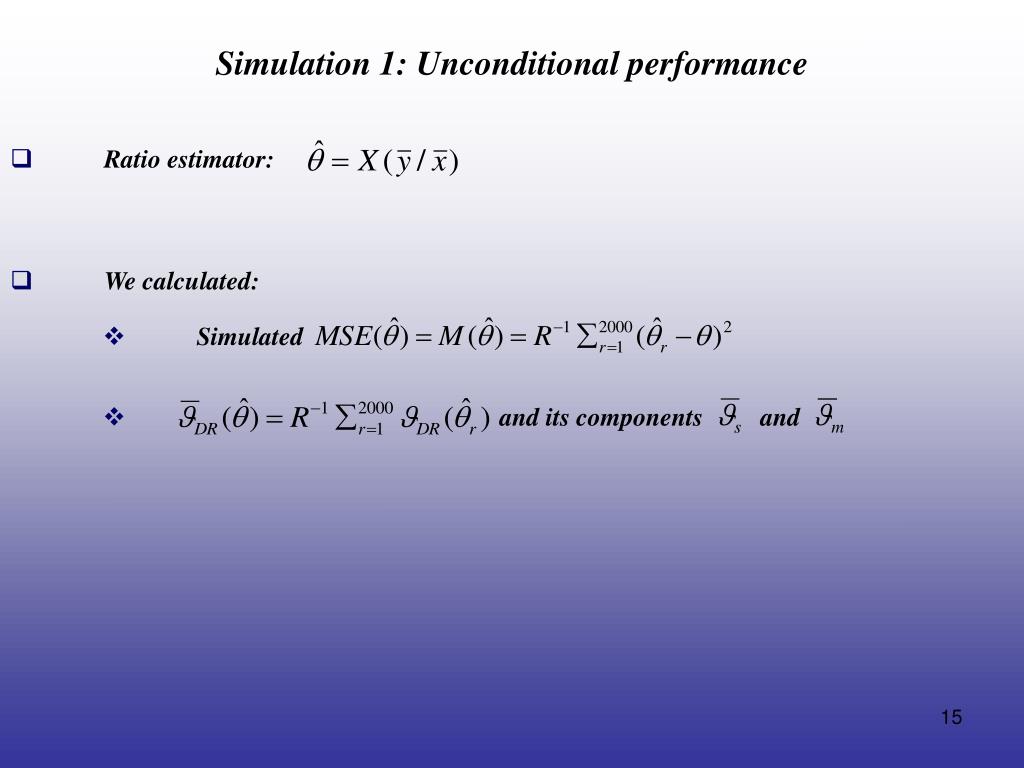 Simulation 1: Unconditional performance • Ratio estimator: • We calculated: • Simulated • and its components and