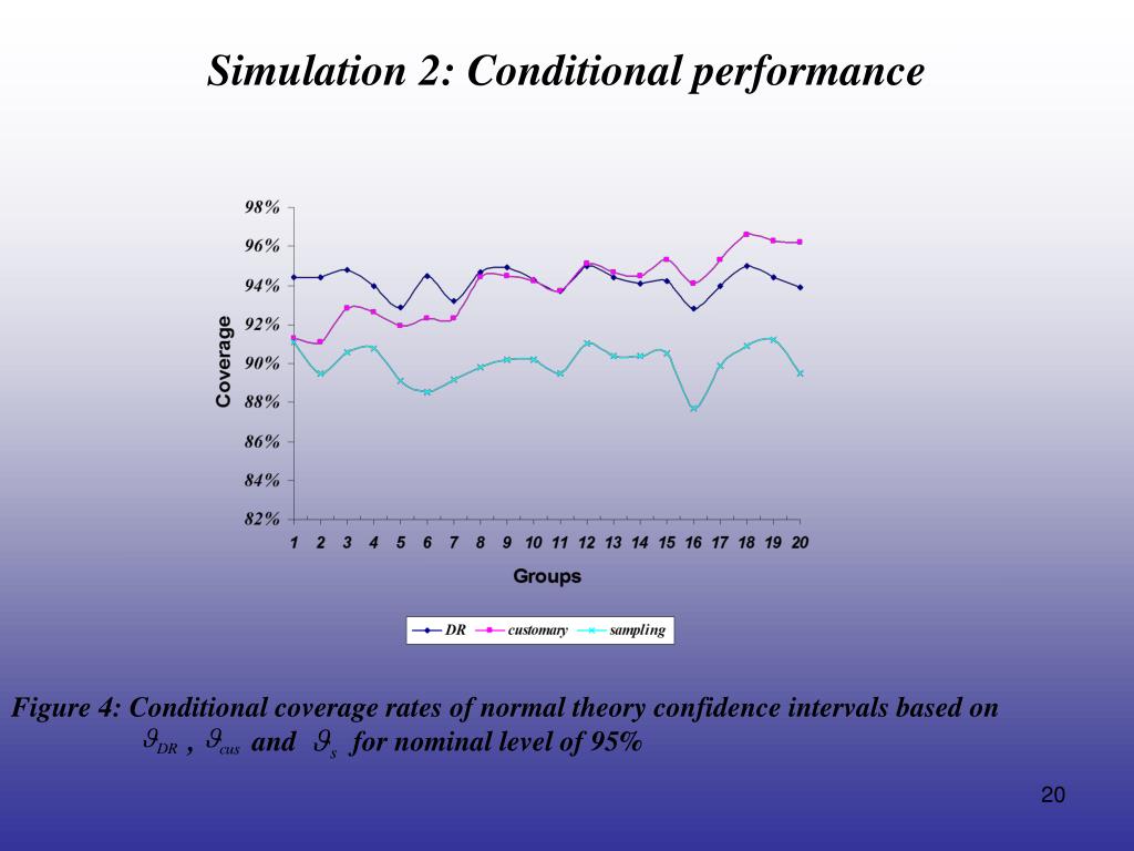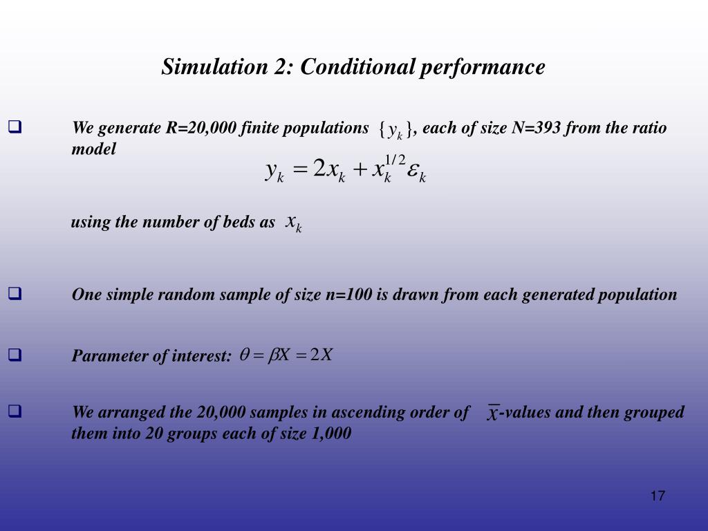 Simulation 2: Conditional performance • We generate R=20,000 finite populations , each of size N=393 from the ratio model using the number of beds as • One simple random sample of size n=100 is drawn from each generated population • Parameter of interest: • We arranged the 20,000 samples in ascending order of -values and then grouped them into 20 groups each of size 1,000