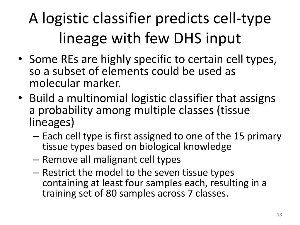 A logistic classifier predicts cell-type lineage with few DHS input • Some REs are highly specific to certain cell types, so a subset of elements could be used as molecular marker. • Build a multinomial logistic classifier that assigns a probability among multiple classes (tissue lineages) • Each cell type is first assigned to one of the 15 primary tissue types based on biological knowledge • Remove all malignant cell types • Restrict the model to the seven tissue types containing at least four samples each, resulting in a training set of 80 samples across 7 classes.