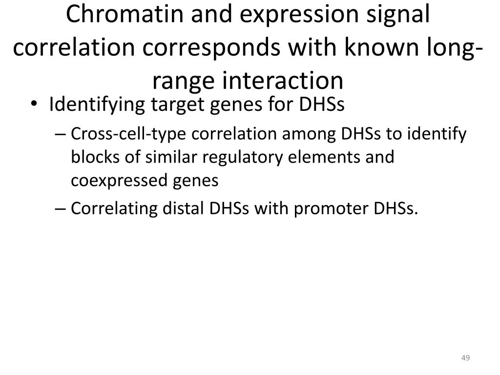 Chromatin and expression signal correlation corresponds with known long-range interaction • Identifying target genes for DHSs • Cross-cell-type correlation among DHSs to identify blocks of similar regulatory elements and coexpressed genes • Correlating distal DHSs with promoter DHSs.