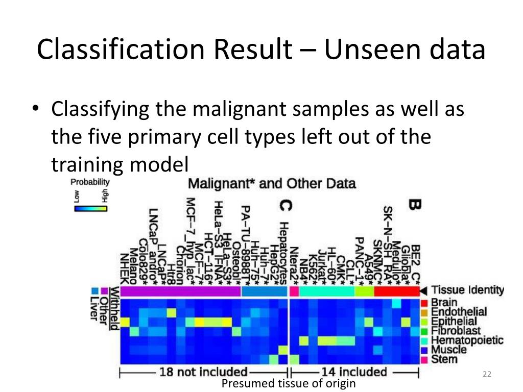 Classification Result – Unseen data • Classifying the malignant samples as well as the five primary cell types left out of the training model Presumed tissue of origin