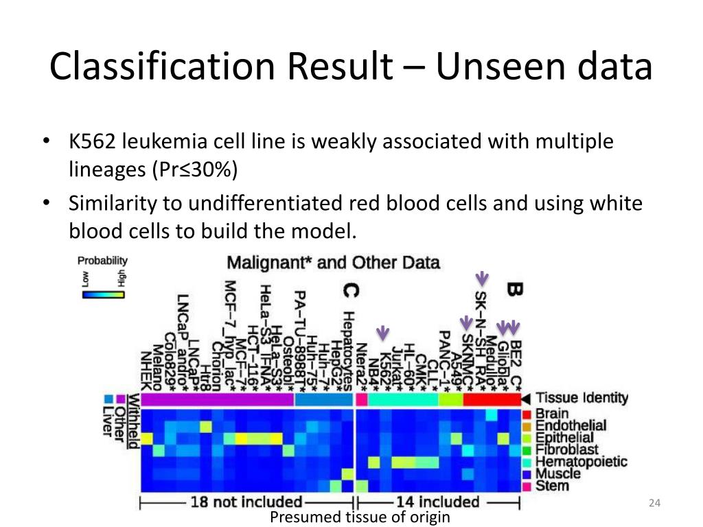 Classification Result – Unseen data • K562 leukemia cell line is weakly associated with multiple lineages (Pr≤30%) • Similarity to undifferentiated red blood cells and using white blood cells to build the model. Presumed tissue of origin