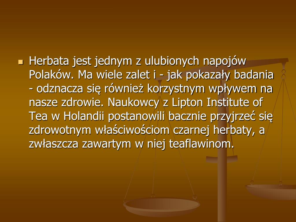 Herbata jest jednym z ulubionych napojów Polaków. Ma wiele zalet i - jak pokazały badania - odznacza się również korzystnym wpływem na nasze zdrowie. Naukowcy z Lipton Institute of Tea w Holandii postanowili bacznie przyjrzeć się zdrowotnym właściwościom czarnej herbaty, a zwłaszcza zawartym w niej teaflawinom.