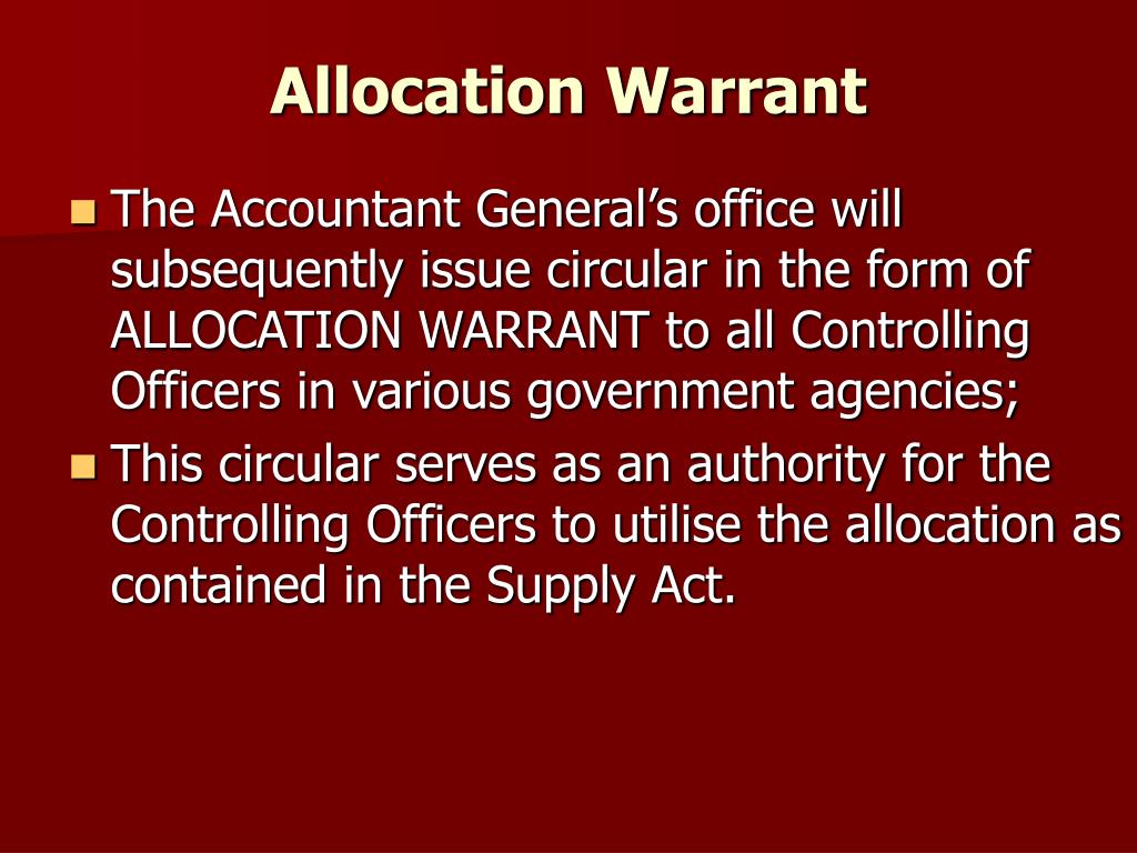 Allocation Warrant • The Accountant General’s office will subsequently issue circular in the form of ALLOCATION WARRANT to all Controlling Officers in various government agencies; • This circular serves as an authority for the Controlling Officers to utilise the allocation as contained in the Supply Act.