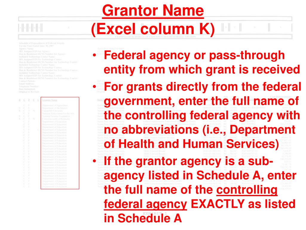 Grantor Name(Excel column K) • Federal agency or pass-through entity from which grant is received • For grants directly from the federal government, enter the full name of the controlling federal agency with no abbreviations (i.e., Department of Health and Human Services) • If the grantor agency is a sub-agency listed in Schedule A, enter the full name of the controlling federal agency EXACTLY as listed in Schedule A