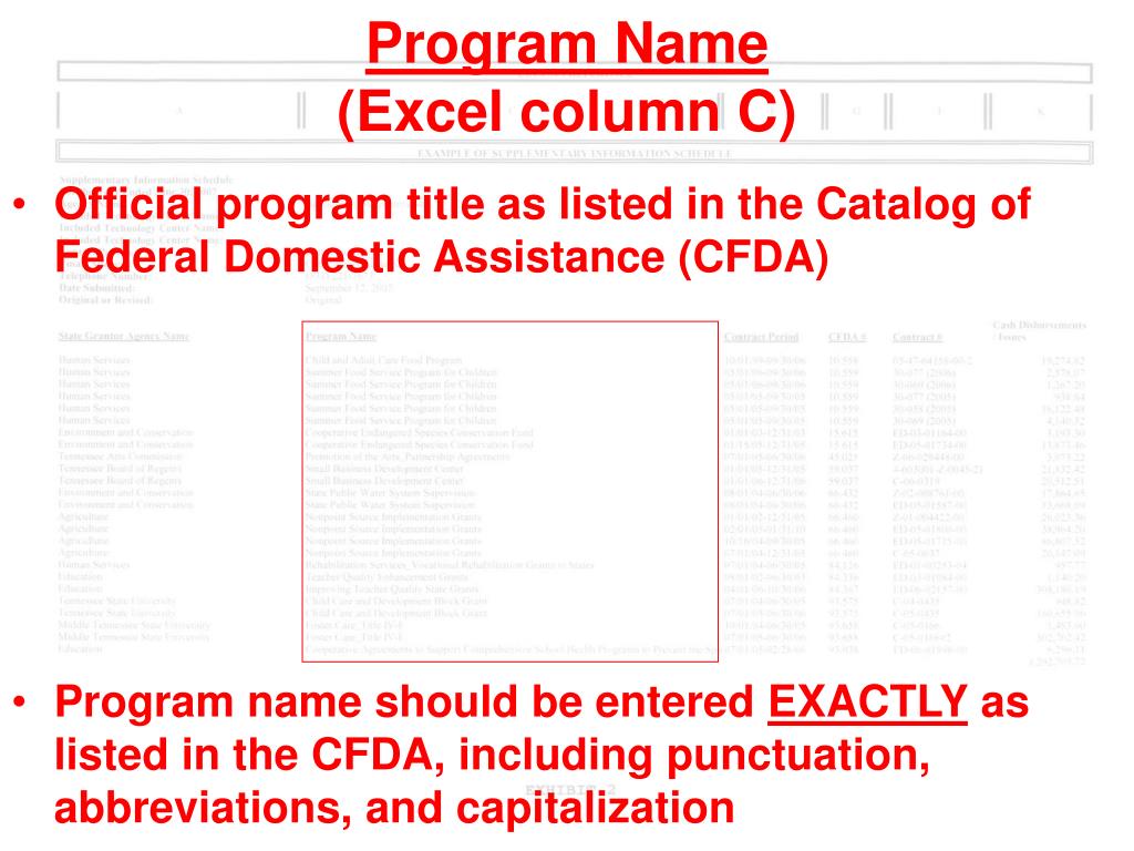 Program Name(Excel column C) • Official program title as listed in the Catalog of Federal Domestic Assistance (CFDA) • Program name should be entered EXACTLY as listed in the CFDA, including punctuation, abbreviations, and capitalization
