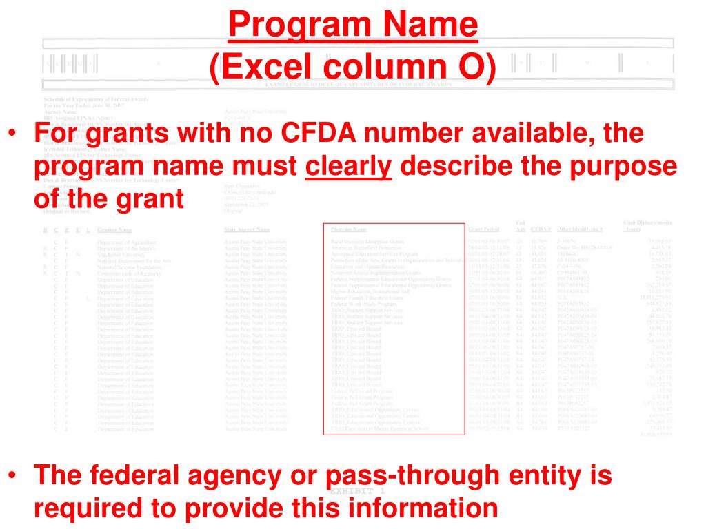 Program Name(Excel column O) • For grants with no CFDA number available, the program name must clearly describe the purpose of the grant • The federal agency or pass-through entity is required to provide this information